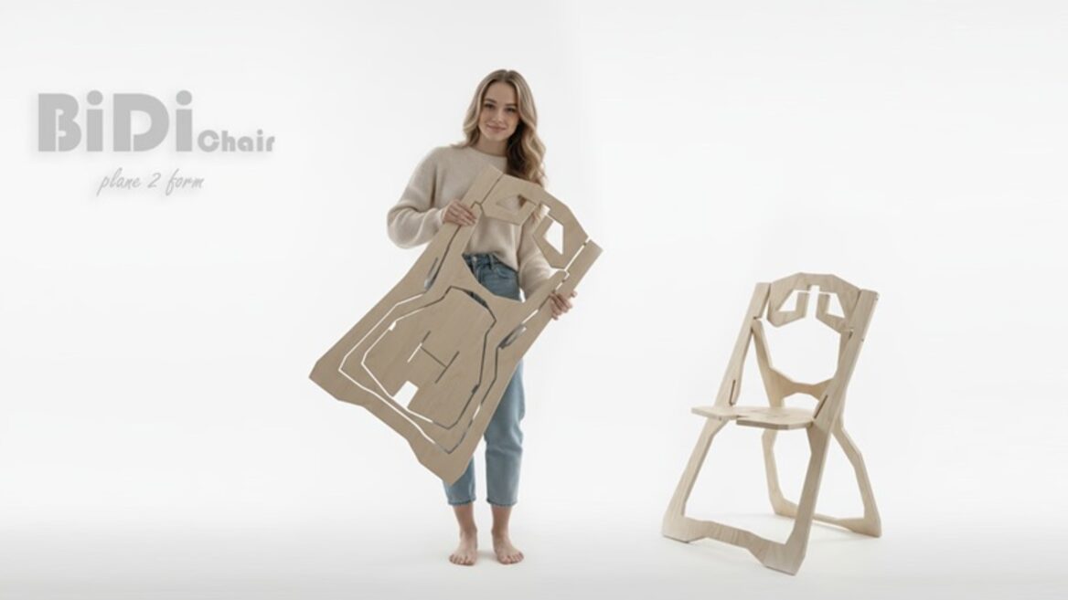 За описом проєкту на Kickstarter, BiDi розшифровується як «bi-dimensional» і задуманий як об’єкт, що буквально переходить із двовимірного стану в тривимірний. У складеному вигляді це майже плоский «лист», який можна притулити до стіни чи заховати за шафою, а в розкладеному — повнорозмірний стілець з нестандартною геометрією. Автор робить акцент на мінімалізмі, простій механіці та тому, що меблі не займають місце, коли ними не користуються.