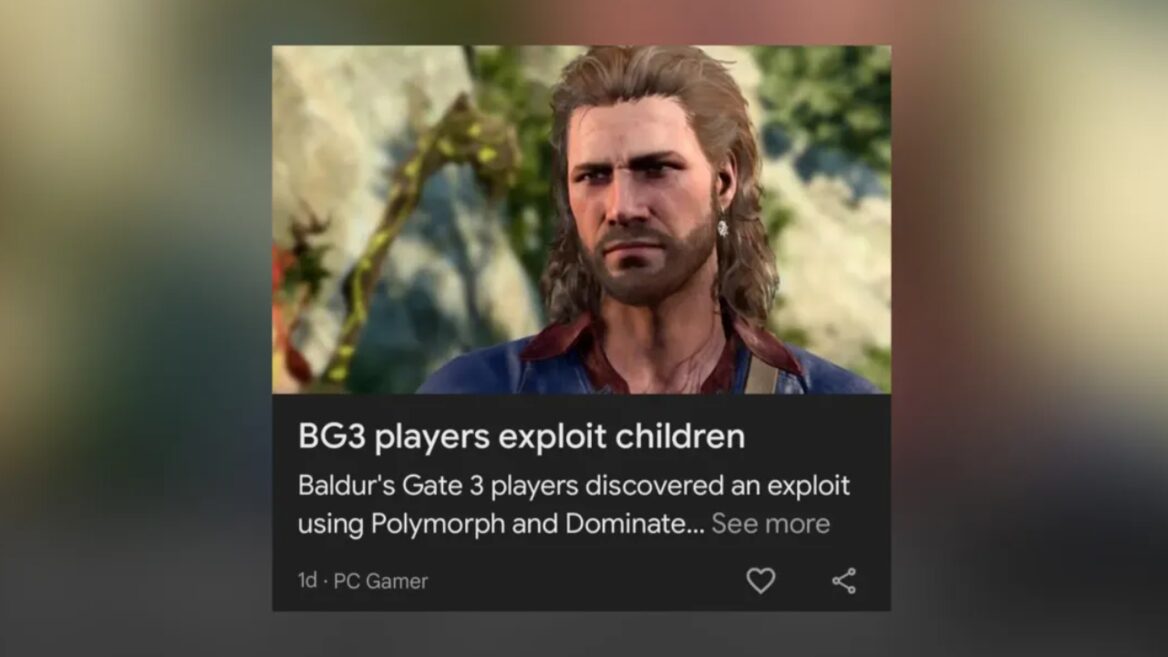 «Гравці BG3 експлуатують дітей», йдеться в одному з таких заголовків до матеріалу про RPG Baldur’s Gate 3. Справжня стаття PC Gamer розповідає про те, як гравці виявили спосіб копіювання віртуальних дітей у відеогрі, а не фактично використовувати дітей, як на це натякає спрощений заголовок.